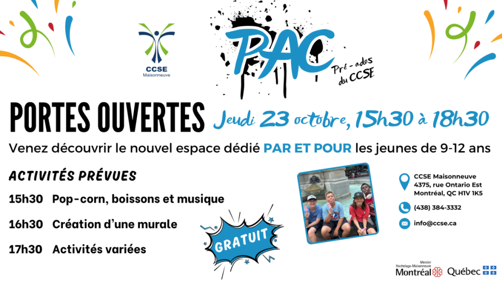 Le CCSE ouvre son local du PAC, tout le long de l’année scolaire à destination des jeunes de 9-12 ans. Nous vous offrons l’opportunité de profiter de cet espace de vie lors d’une après-midi portes ouvertes, le jeudi 23 octobre, de 15h30 à 18h30.