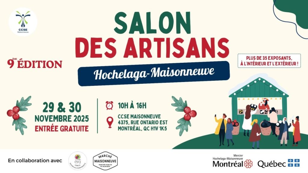 Le CCSE Maisonneuve vous invite les 29 et 30 novembre, de 10h à 16h, pour une neuvième édition de son salon, en collaboration avec le Marché Maisonneuve. Venez découvrir les produits artisanaux de plus de 35 exposants présents à l’intérieur et à l’extérieur.