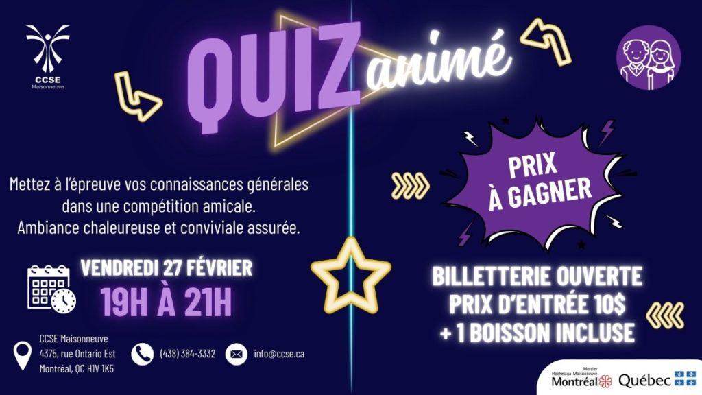 Déployez vos connaissances lors d’une soirée quiz, le 𝐯𝐞𝐧𝐝𝐫𝐞𝐝𝐢 𝟐𝟕 𝐟𝐞́𝐯𝐫𝐢𝐞𝐫, 𝐝𝐞 𝟏𝟗 𝐚̀ 𝟐𝟏𝐡. Venez en famille ou entre ami.e.s pour passer un moment chaleureux et dynamique.