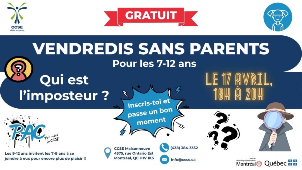 Le CCSE Maisonneuve invite les jeunes de 7-12 ans le vendredi 17 avril, de 18h à 20h, pour passer une soirée à suspense au sein du PAC.