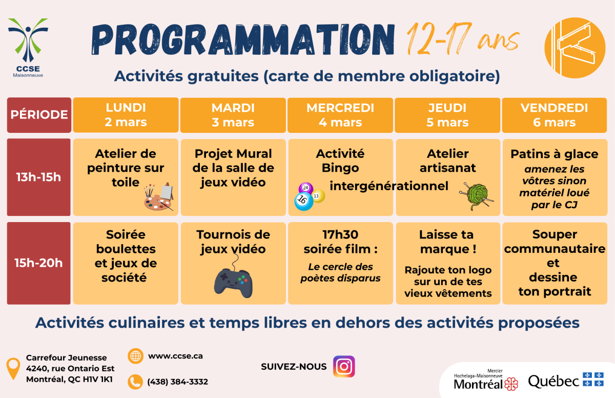 En ligne via votre compte Sport-Plus ou en personne au CCSE Maisonneuve. Cette année, le programme sera dans le thème « À la conquête des pièces d’or » inspiré de l’univers Mario Bros. La programmation sera dévoilée en janvier pour le plus grand bonheur des petits et grands.